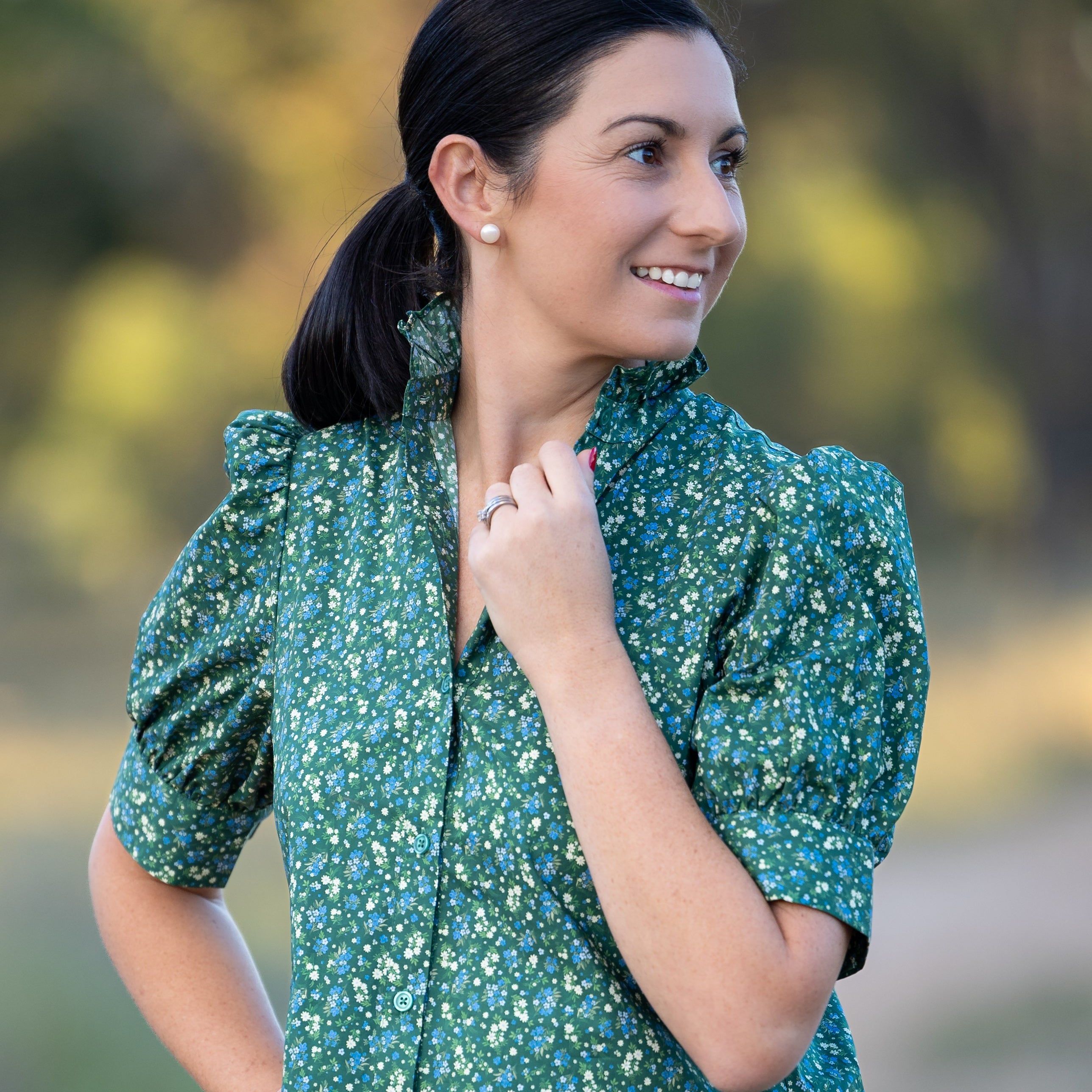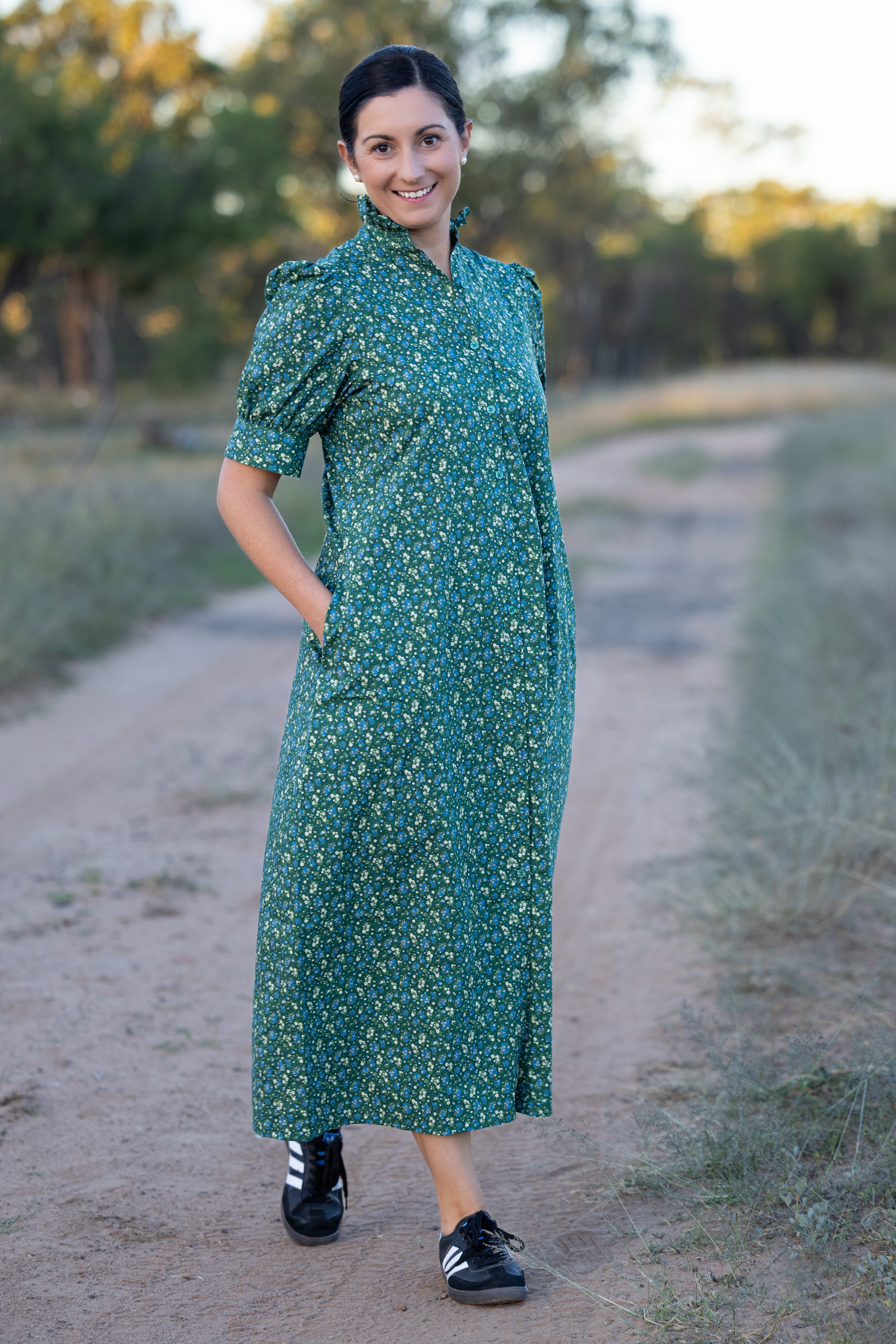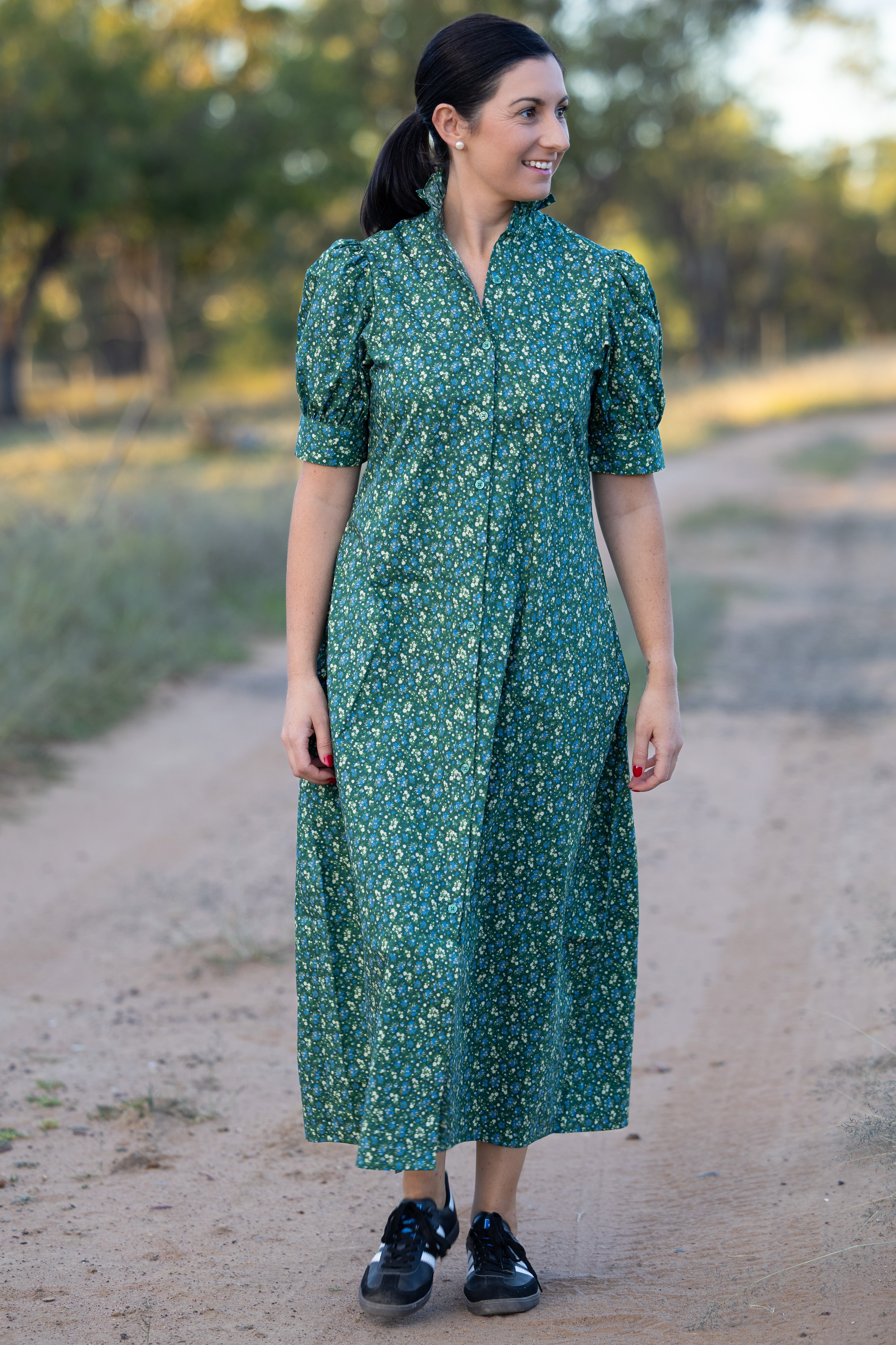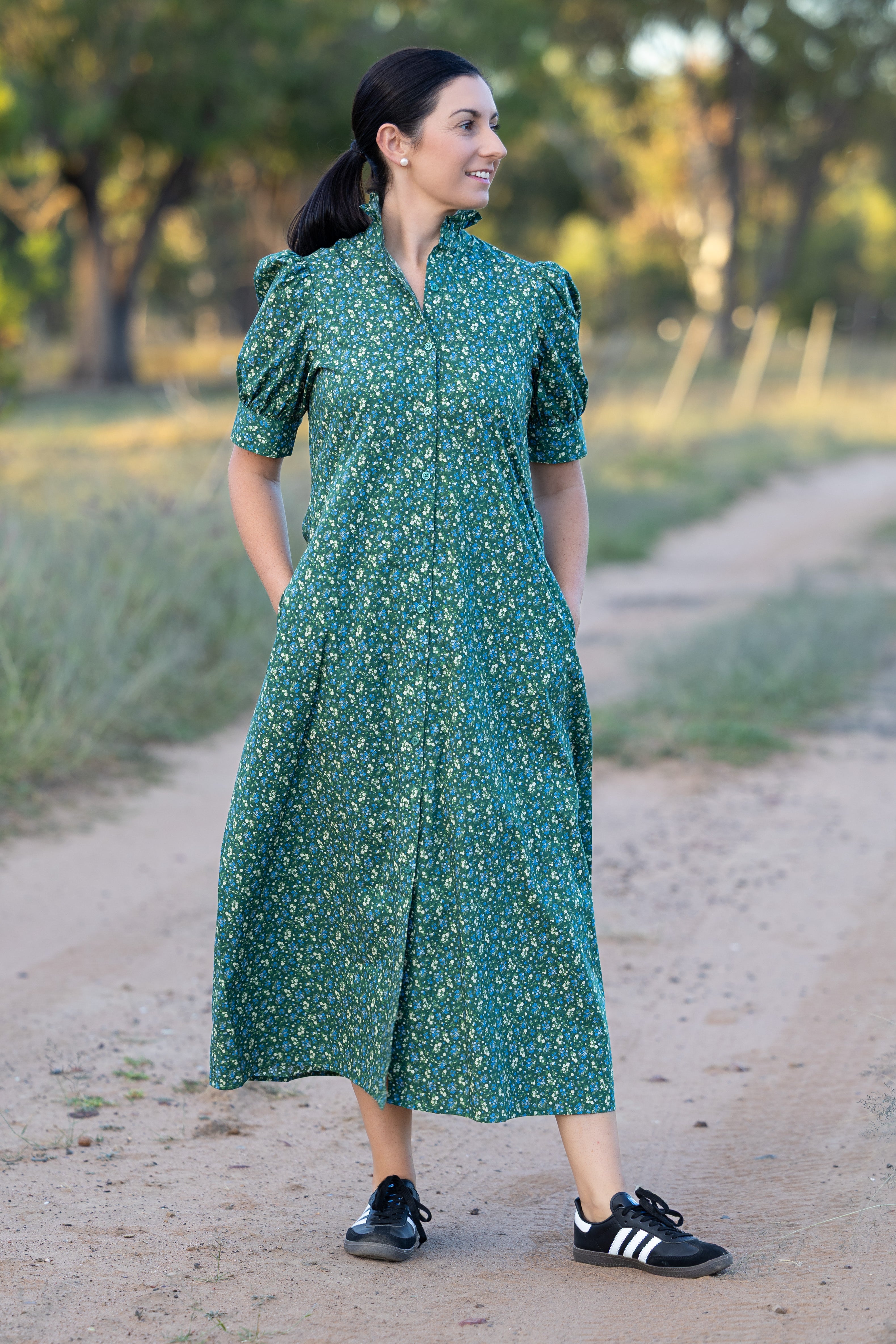 In a beautifully bold green floral print, this dress brings new life to a timeless silhouette. With its frill collar and cuffed sleeves, it strikes the perfect balance between romance and wearability. Whether styled with boots in cooler months or layered over jeans for a relaxed twist, it’s a piece you’ll reach for year-round.
