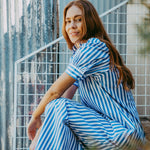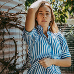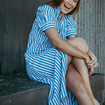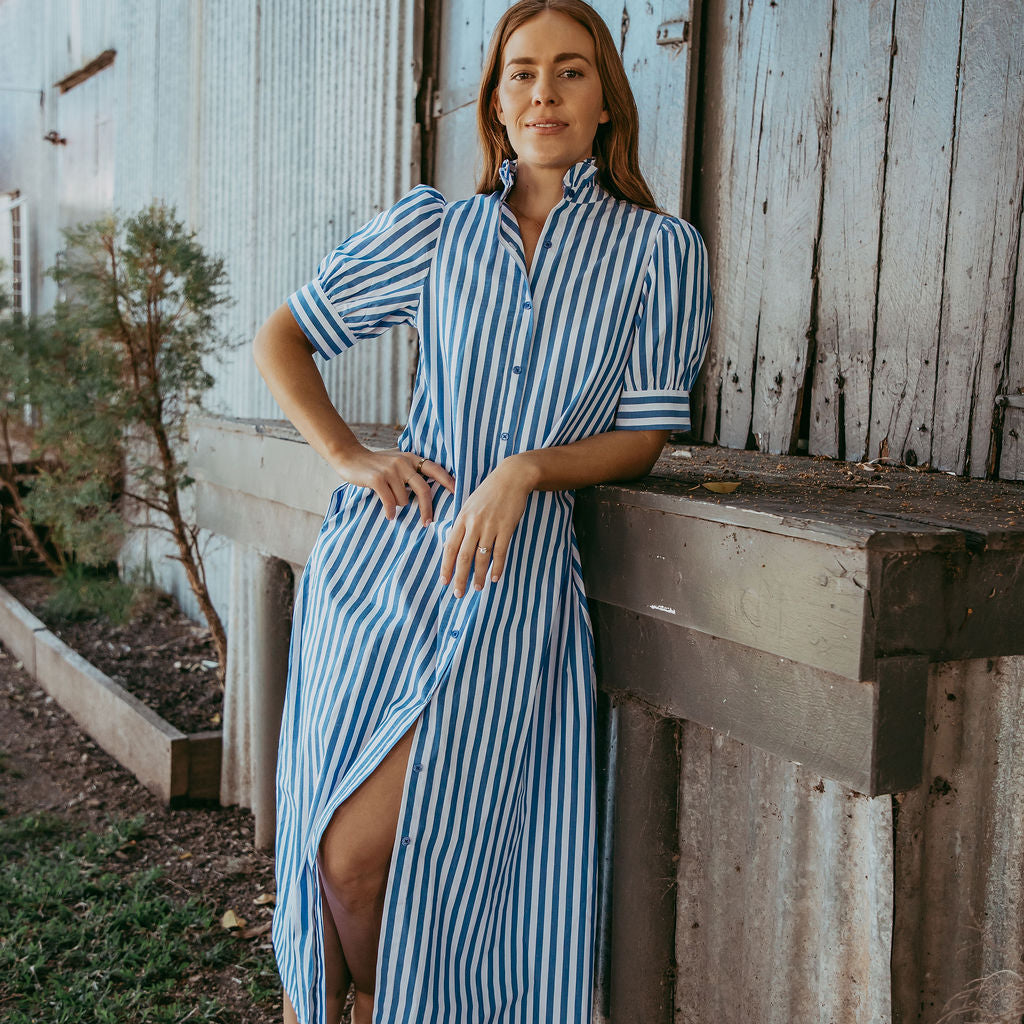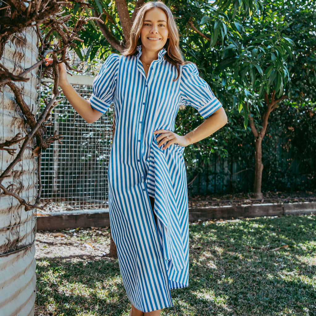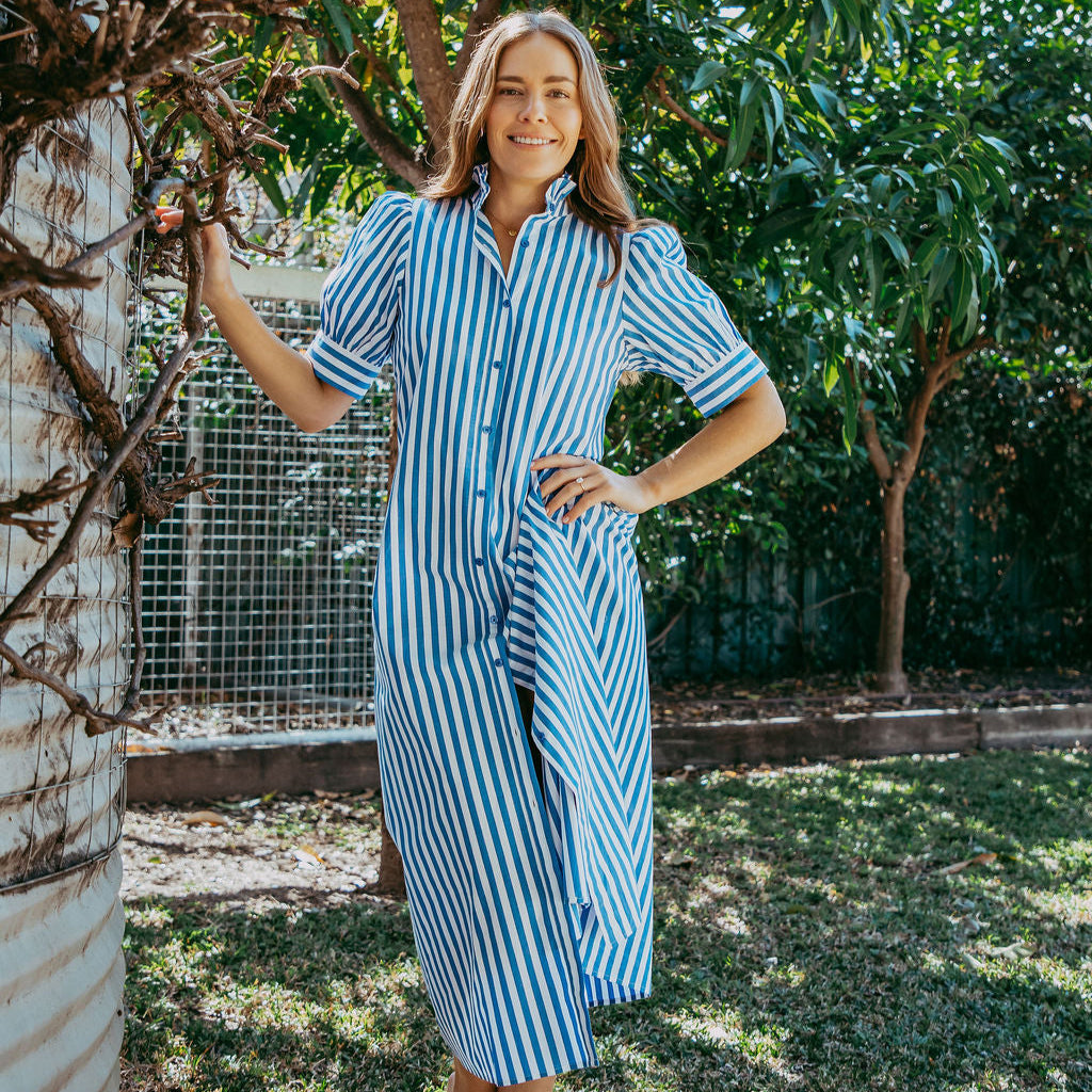 In a beautifully fresh Blue and White striped print, this dress brings new life to a timeless silhouette. With its frill collar and cuffed sleeves, it strikes the perfect balance between romance and wearability. Whether styled with boots in cooler months or dress up with sandals in Summer, it’s a piece you’ll reach for year-round.