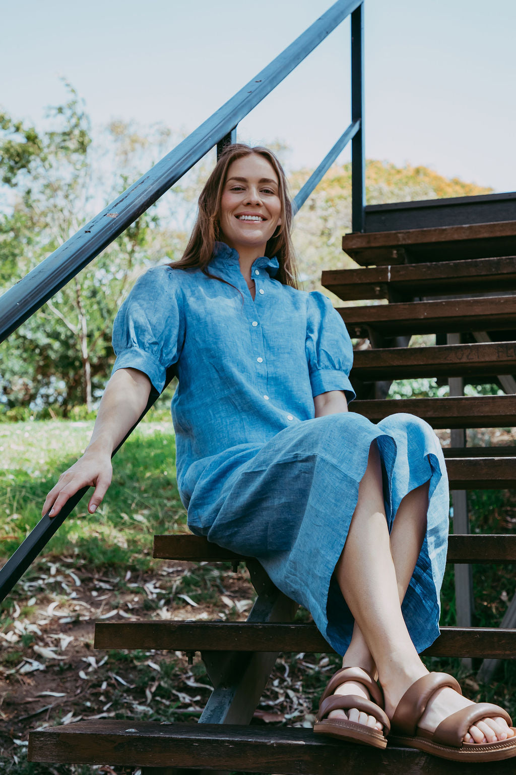 In a beautiful blue soft linen, this dress brings new life to a timeless silhouette. With its frill collar and cuffed sleeves, it strikes the perfect balance between romance and wearability. Whether styled with boots in cooler months or dress up with sandals in Summer, it’s a piece you’ll reach for year-round.