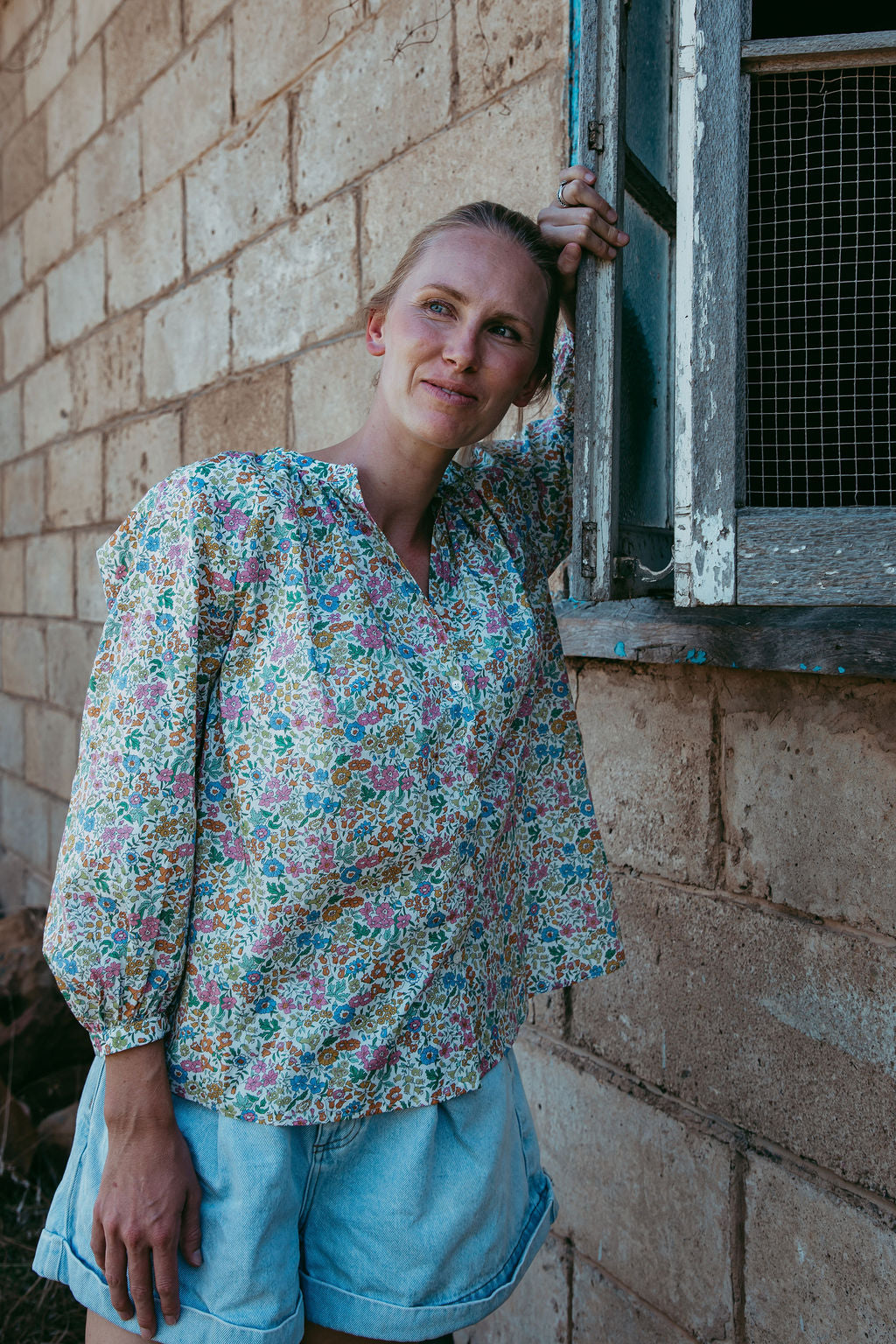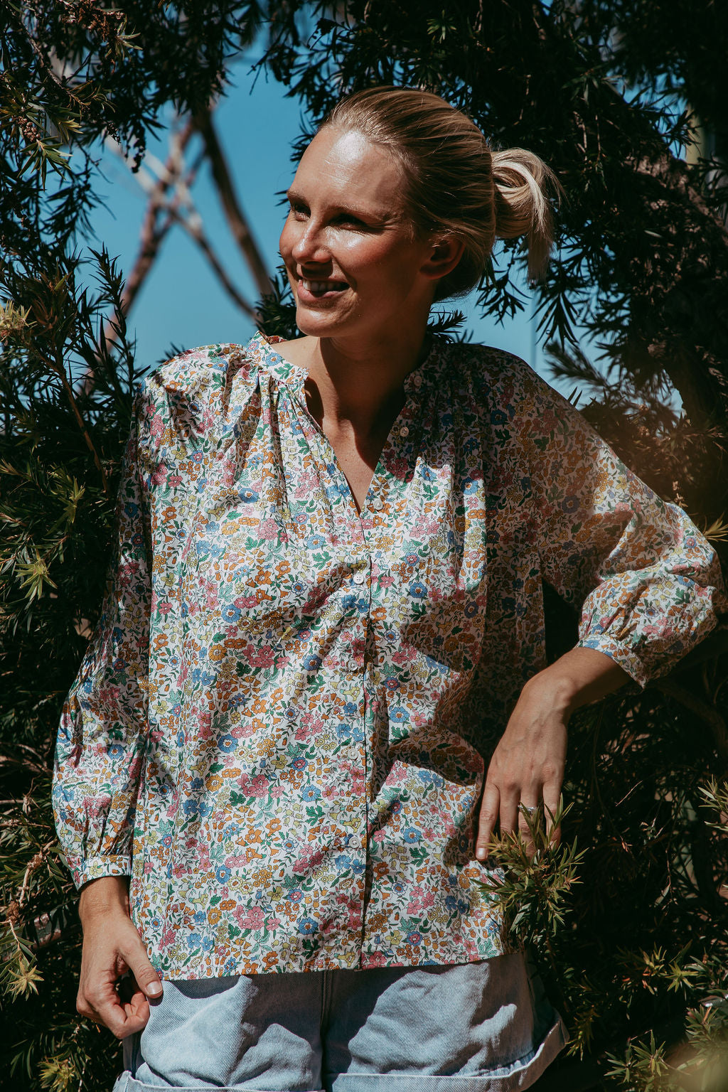 Emma Amelia Blouse channels Liberty's heritage with a charming floral design inspired by 1930s pattern archives. Delicate foxgloves, primroses, daisies, and bluebells create a timeless aesthetic that pairs effortlessly with any wardrobe.