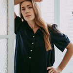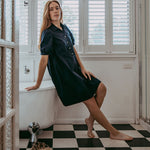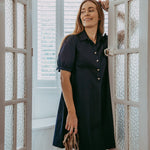 A swing dress designed to move with you. This dress is made of the most beautiful quality navy cotton with statement gold buttons, not too long and not too short. This can be worn with sneakers or sandals or boots and tights in the cooler months