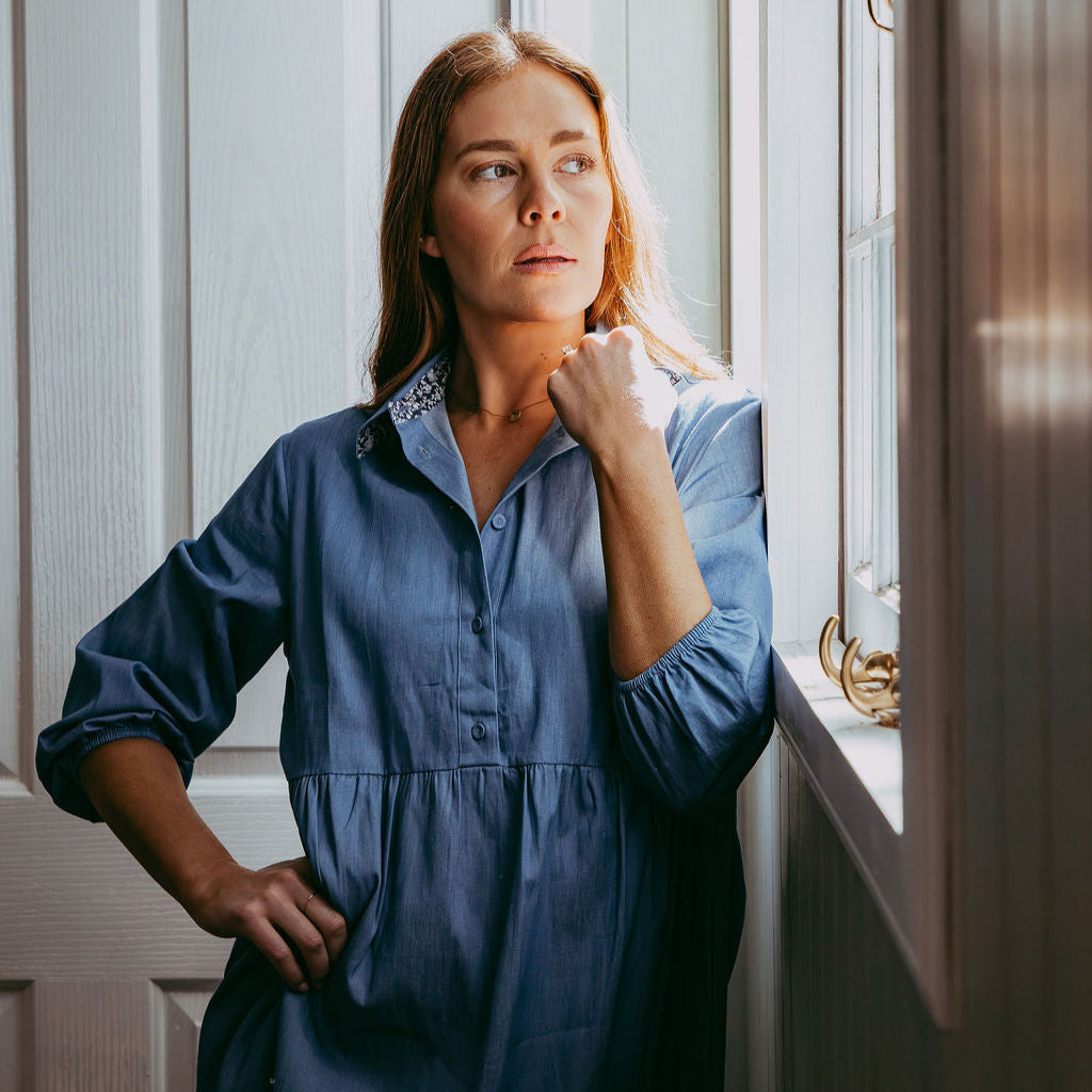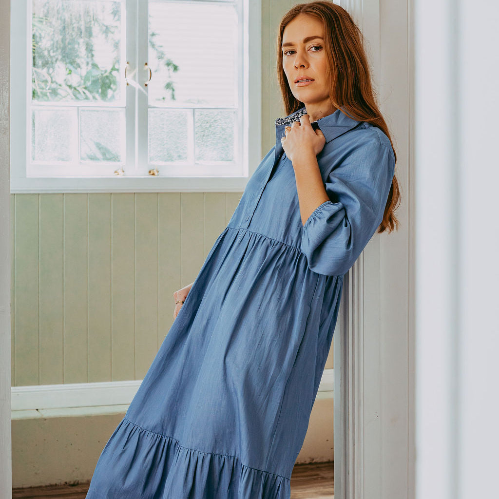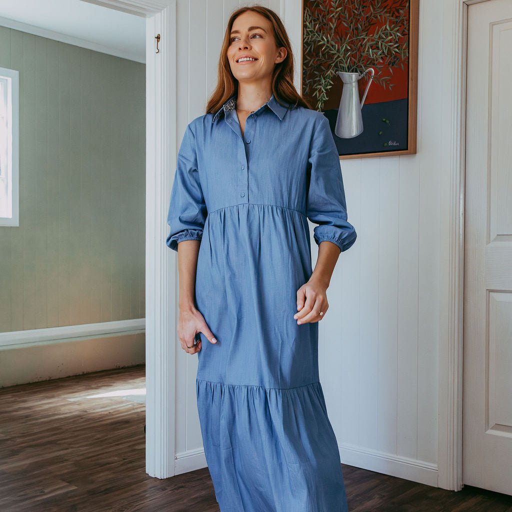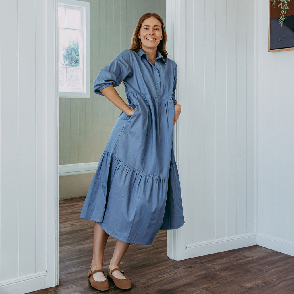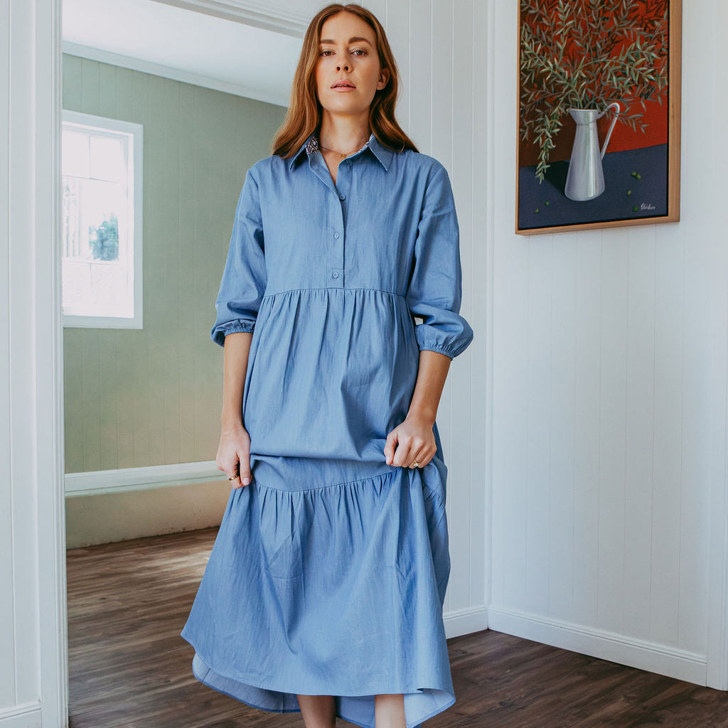 Tiered Collared Chambray Cotton Dress Featuring Liberty Fabrics