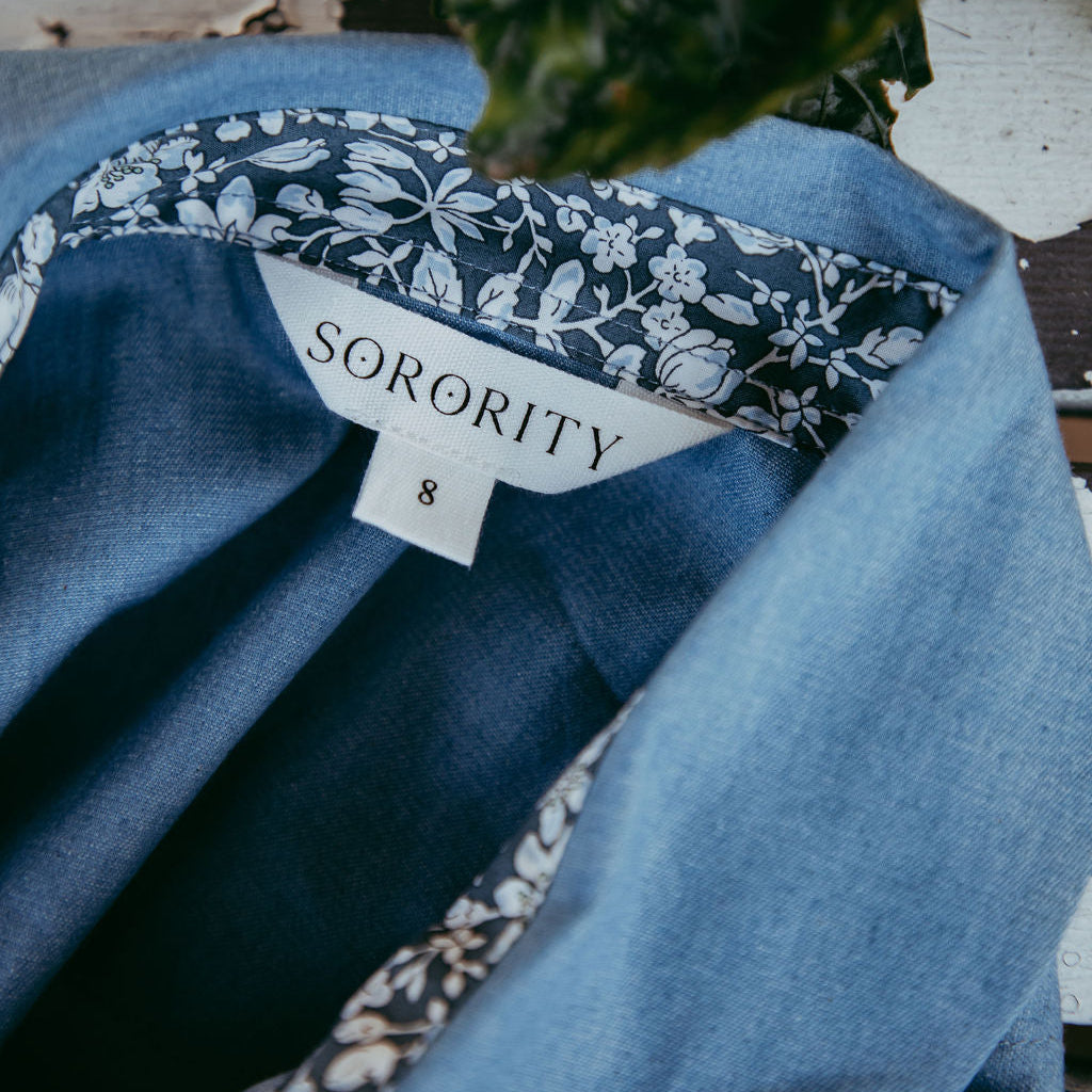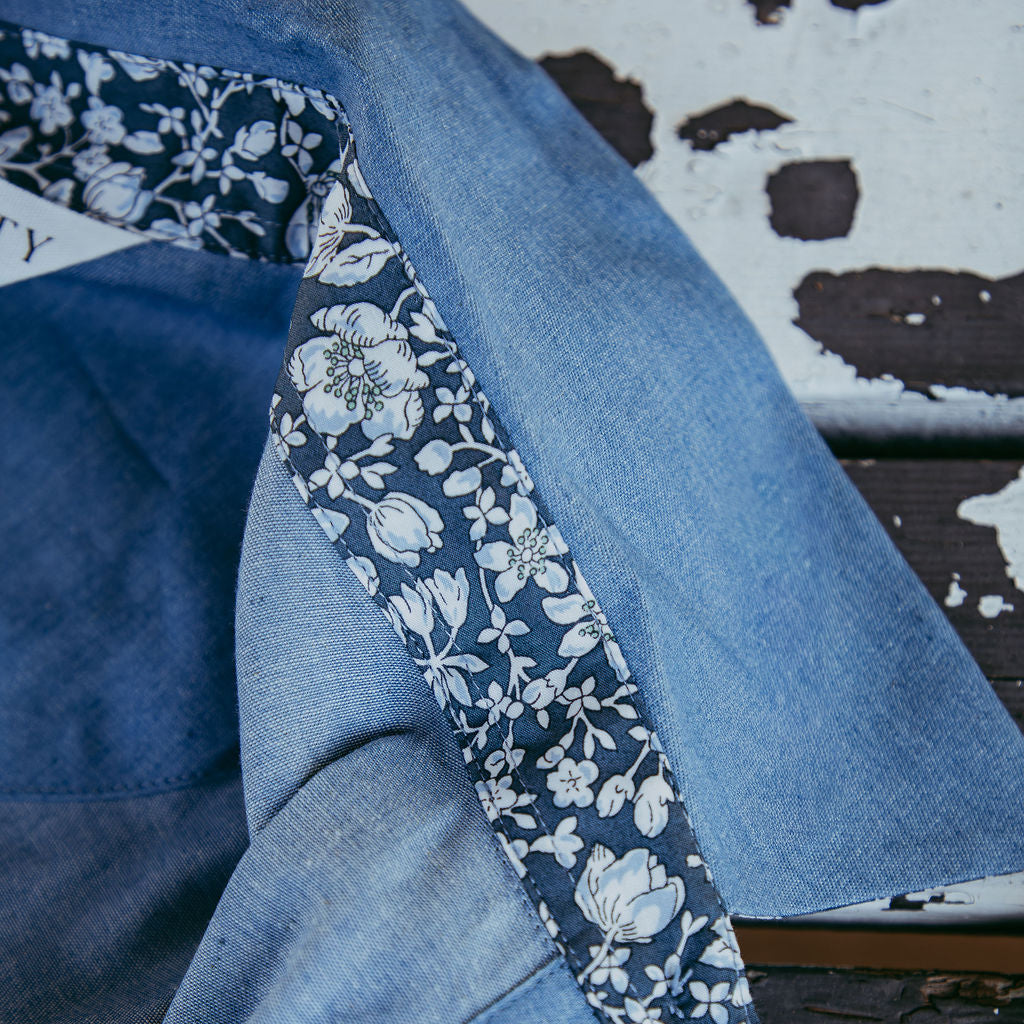 A statement Collar Featuring a beautiful Liberty Print and a stunning cotton chambray